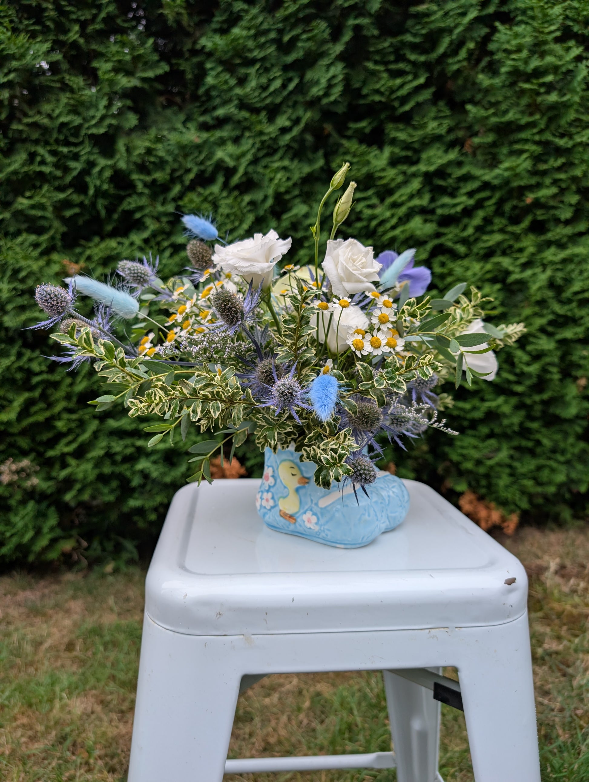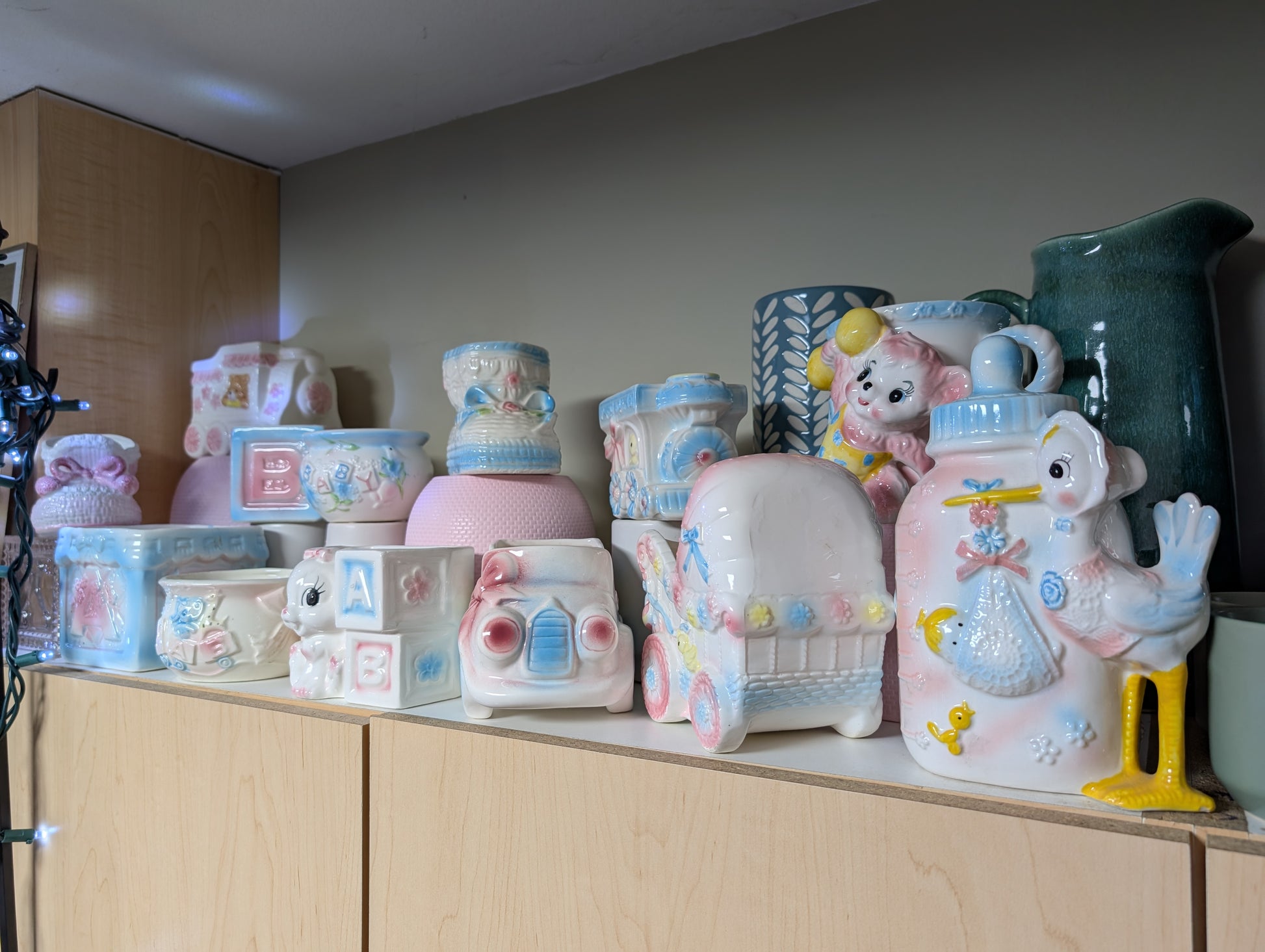 We are SO EXCITED to share our ever-changing collection of VINTAGE baby arrangement containers with you! They are all thrifted by Britt & Ava!